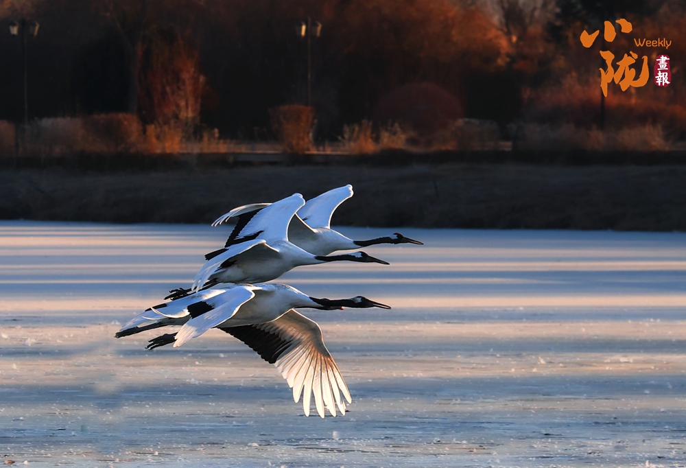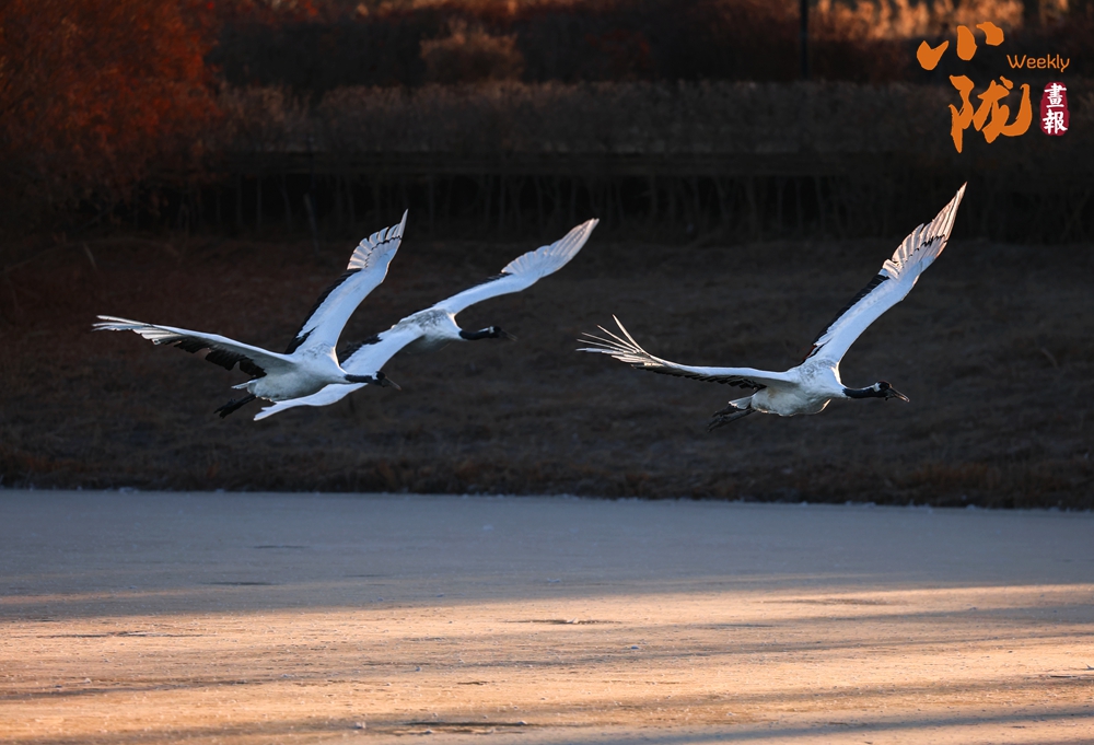 冰面映照著澄澈藍(lán)天,丹頂鶴展翅掠水,引頸高歌,清脆的鳴叫聲仿佛是大自然奏響的美妙樂章。
