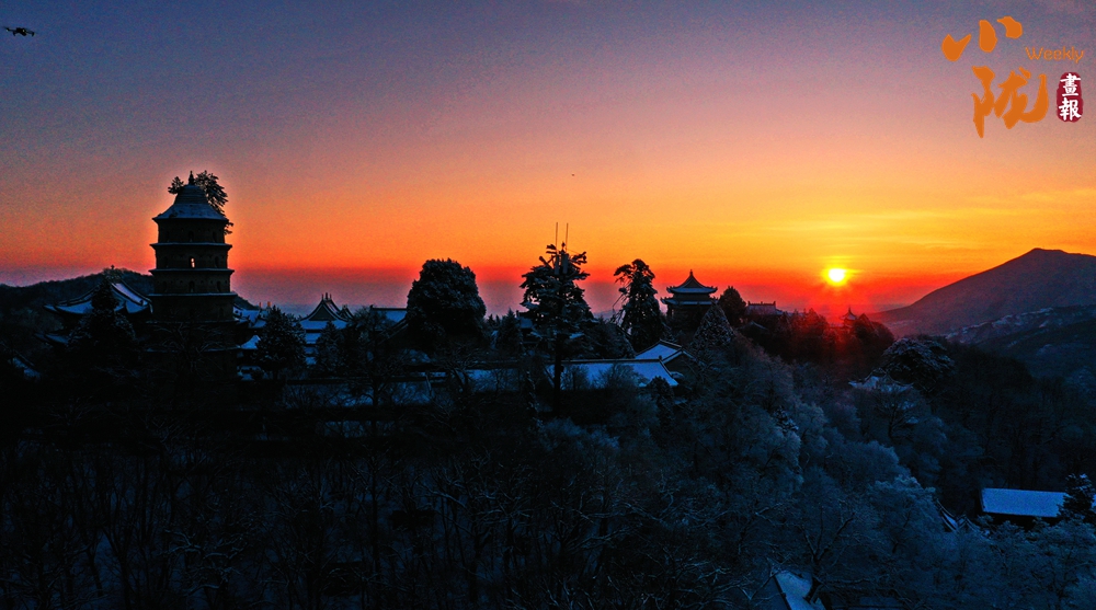 群山裹素,起伏的線條在極致湛藍(lán)的天穹下舒展,積雪壓彎枝頭,形成道道玉弧。而點(diǎn)綴其間的廟宇樓閣,默然佇立,飛檐上的殘雪泛著微光,與這片寧靜的藍(lán)白色調(diào)共同構(gòu)成一幅和諧、安詳?shù)男麓貉┚啊?/p>