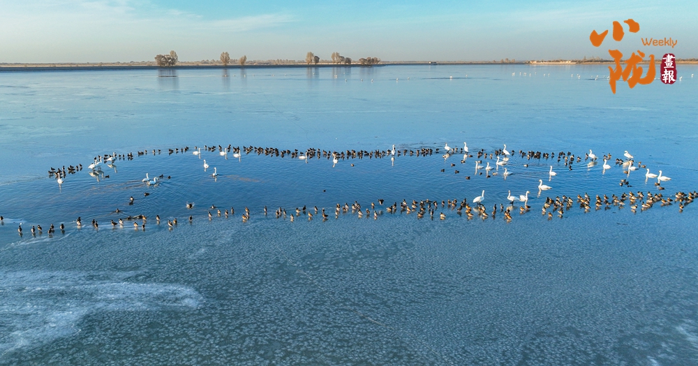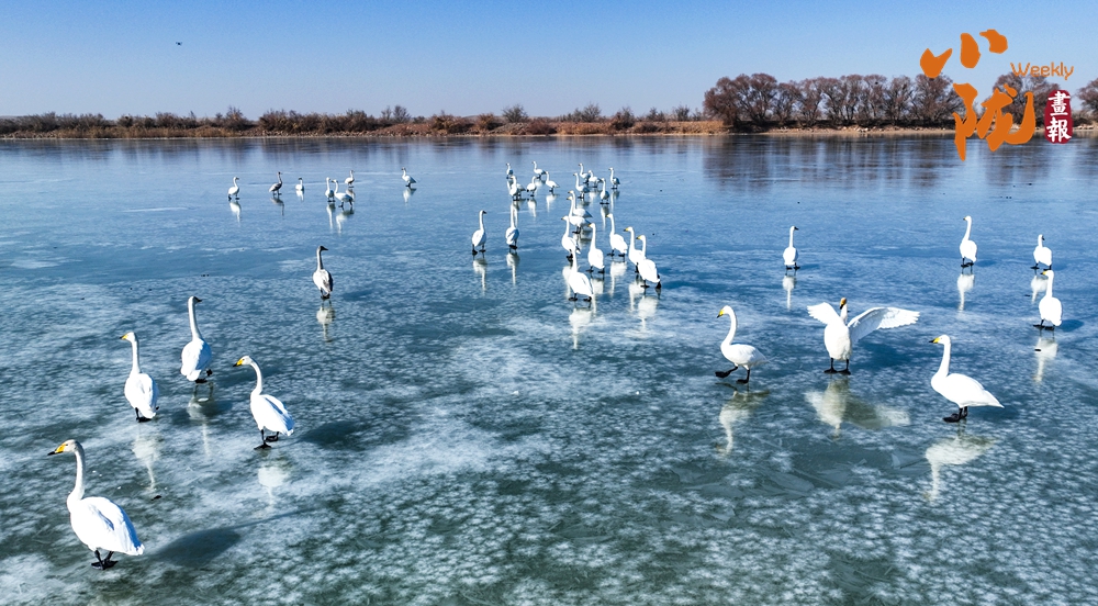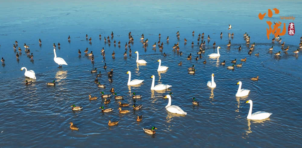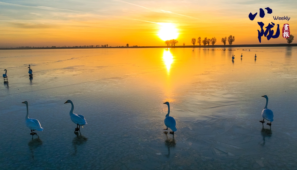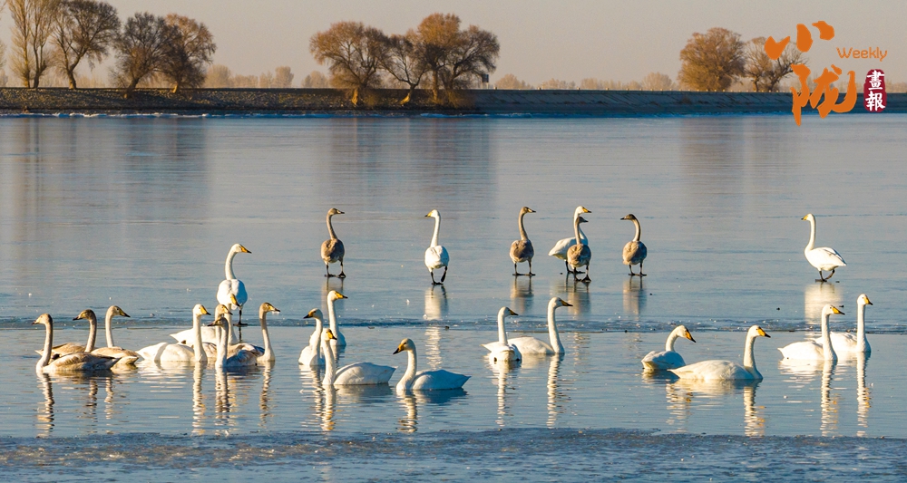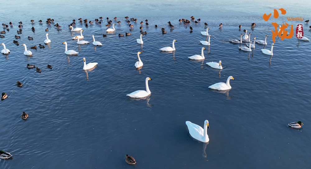 陽(yáng)光斜照,萬物生暖。水面上,成群的白天鵝不緊不慢地游著,雪白的身影倒映水中,隨著微波輕輕蕩漾,像是一幅流動(dòng)的水墨畫,素雅而安寧。
