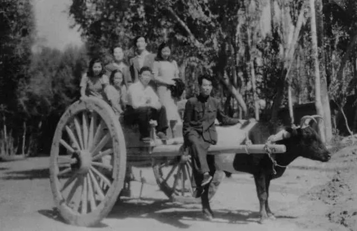 孫儒僴(前排右二)與同事們坐在牛車(chē)上(資料照片)。受訪者供圖