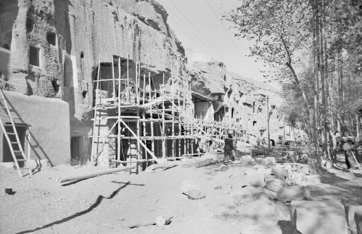 工作人員對(duì)莫高窟部分洞窟進(jìn)行加固施工(1964年7月8日攝)。敦煌研究院供圖