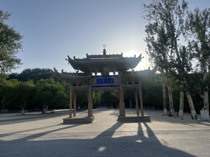 大牌坊是莫高窟另一處標(biāo)志性景觀。要進(jìn)入莫高窟窟區(qū),首先得經(jīng)過(guò)這座莊重質(zhì)樸、飛檐翹角的牌坊。牌坊匾額東面是“石室寶藏”,西面是“三危攬勝”,夕陽(yáng)西下時(shí),更顯古韻。