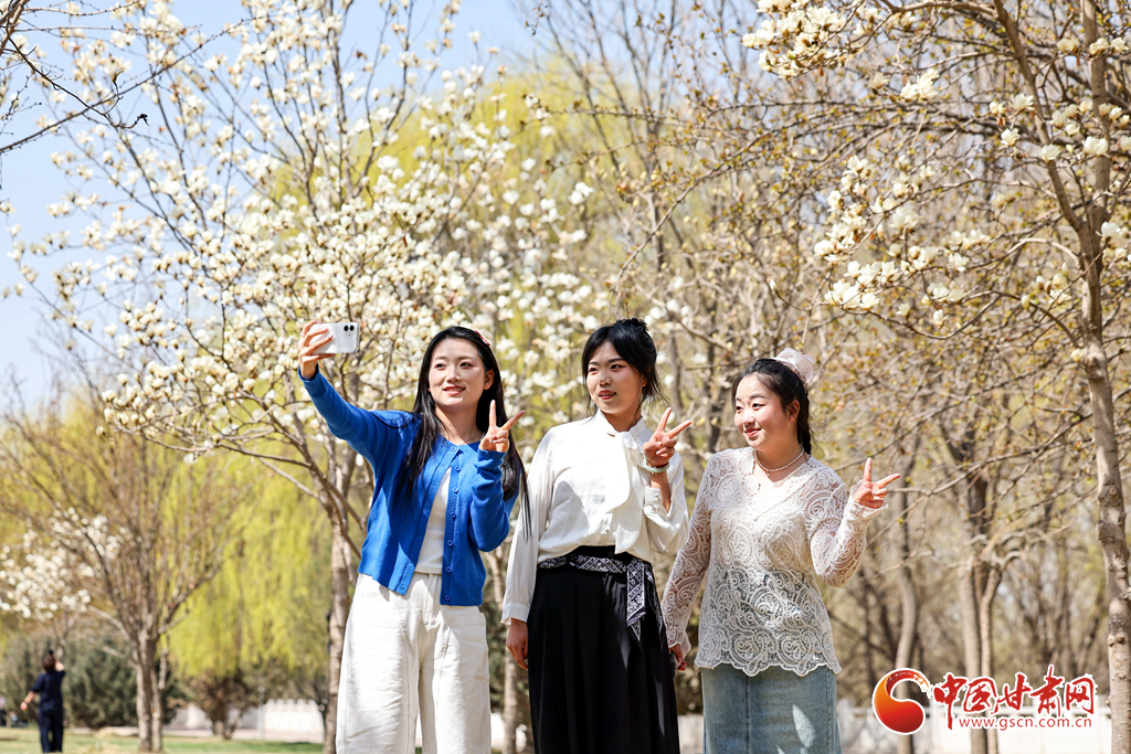 3月24日,市民在蘭州市七里河區(qū)南賓河中路賞花拍照留影。